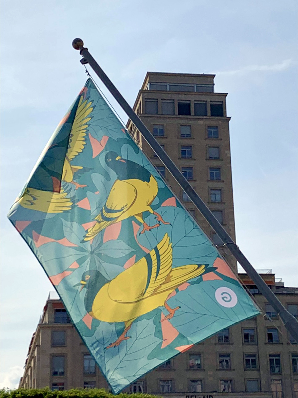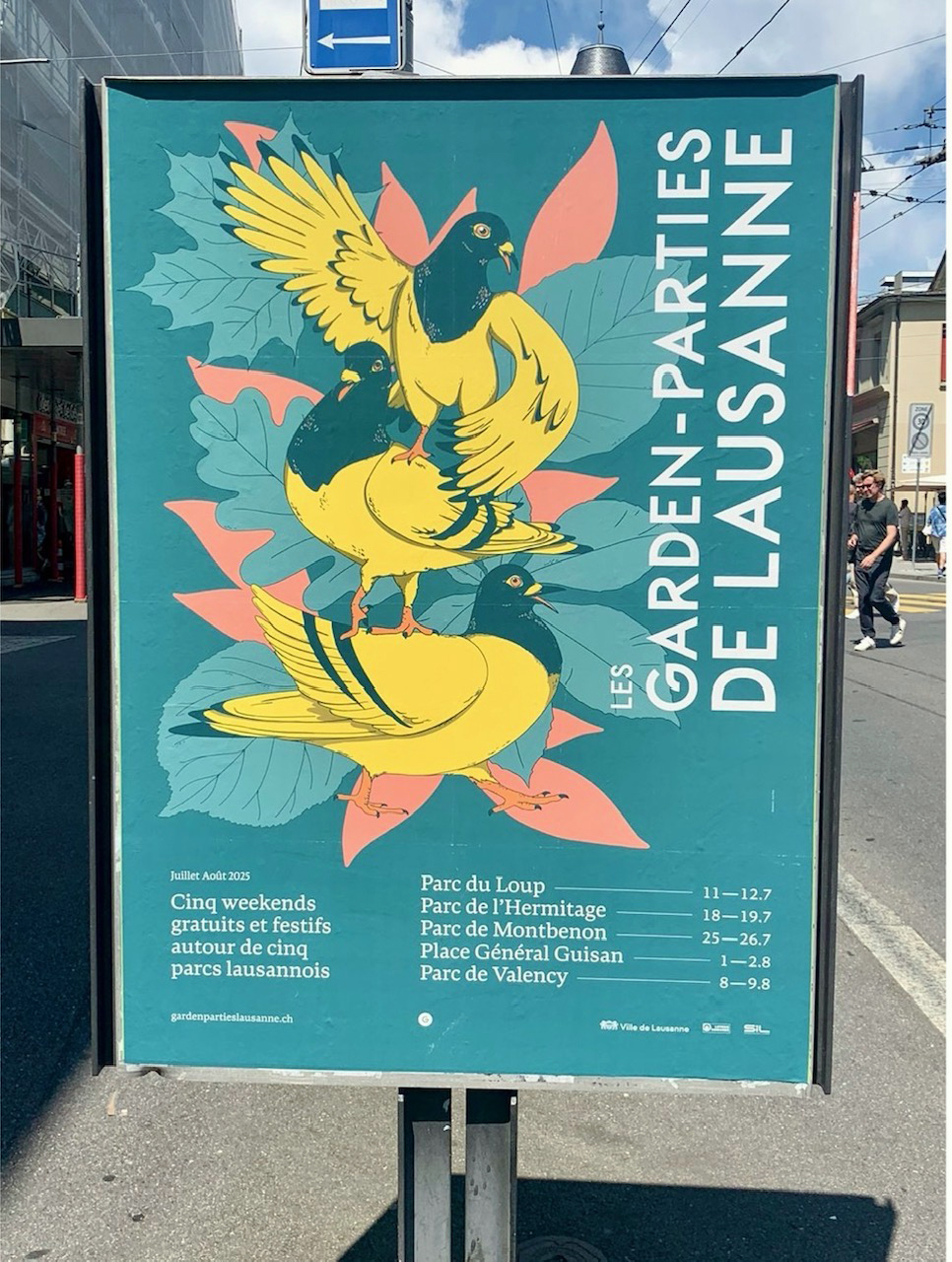 Visuels imaginés pour Les Garden-Parties de Lausanne: Cinq week-ends gratuits et festifs dans cinq parcs Lausannois, juillet – août 2025. Des pigeons urbains qui célèbrent et une essence d’arbres pour représenter chaque parc.